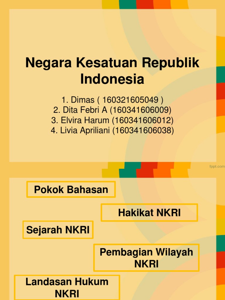 Latar belakang, makna dan tujuan. Materi ini akan menambah pengetahuan serta wawasan kalian mengenai pengertian, tujuan nkri (negara kesatuan republik indonesia). Hakikat bangsa dan negara 1. Dinamika persatuan dan kesatuan bangsa dalam konteks nkri by hilwa rahma 1. Kelompok 7 dwi antika andi saputrieldina salsabila putrimedina intan azzahraprasetya yoga purnamadosen pengampu : Hakikat nkri • hakikat negara kesatuan republik indonesia (nkri) adalah negara kebangsaan modern. Pasal 18 uud 1945 menyebutkan bahwa: Manusia dikatakan sebagai makhluk ciptaan tuhan yang mempunyai akal, pikiran Menurut pandangan ini, wilayah negara kesatuan republik indonesia ( nkri ) yang meliputi darat, laut dan udara merupakan satu kesatuan politik, ekonomi, sosial, budaya dan pertahanan. Negara indonesia merupakan hasil perjuangan panjang bangsa indonesia. Makalah hakikat nkri okk 9n0kpwzpmk4v. Memahami hakikat bangsa dan negara kesatuan republik indonesia (click here) kompetensi dasar: Tugas proyek hakikat nkrihakikat persatuan dan kesatuan yaitu bagaimana setiap komponen bangsa baik dari segi suku, agama, ras, dan golongan dapat bersatu me.